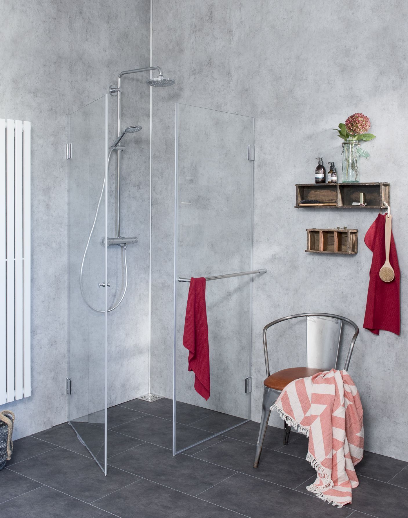 Mehr Infos zu "Bündige Eck-Duschkabine mit Festwand und Tür an Wand"