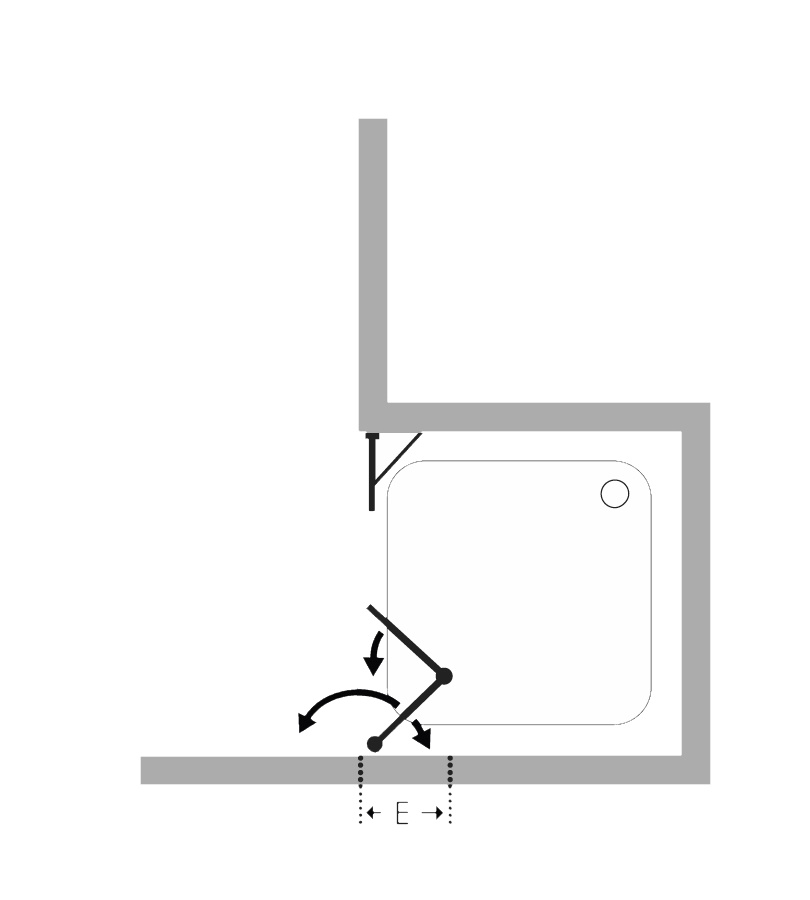 Die faltbare Pendel Duschtür schließt mit einem Magnetverschluss und kann für einen großzügigen Einstieg nach innen und außen voll geöffnet werden (gesamt 180°). Dazu kann die äußere Falttür mit Griff außen auf die Pendeltür gefaltet werden und dann beide Duschtüren platzsparend nach innen an die Wand geklappt werden (Einklappmaß E beachten, nach außen kann die zusammengefaltete Tür wegen der Griffe nur bis zu 45° an die Wand geklappt werden). Die Pendeltür bleibt in ihrer Endposition stehen, bis circa 30° Öffnungswinkel schließt die Glas Pendeltür automatisch.