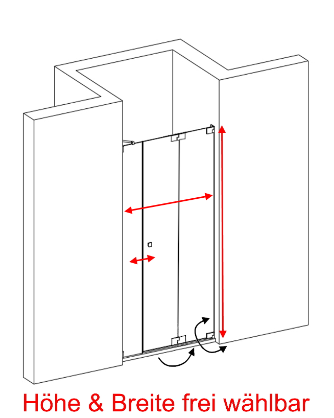 Sondermaß Nischendusche mit Falttür in klarem, satiniertem, farbigem oder OptiShower 8 mm ESG Sicherheitsglas