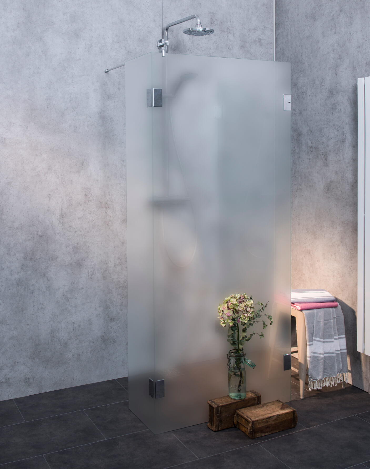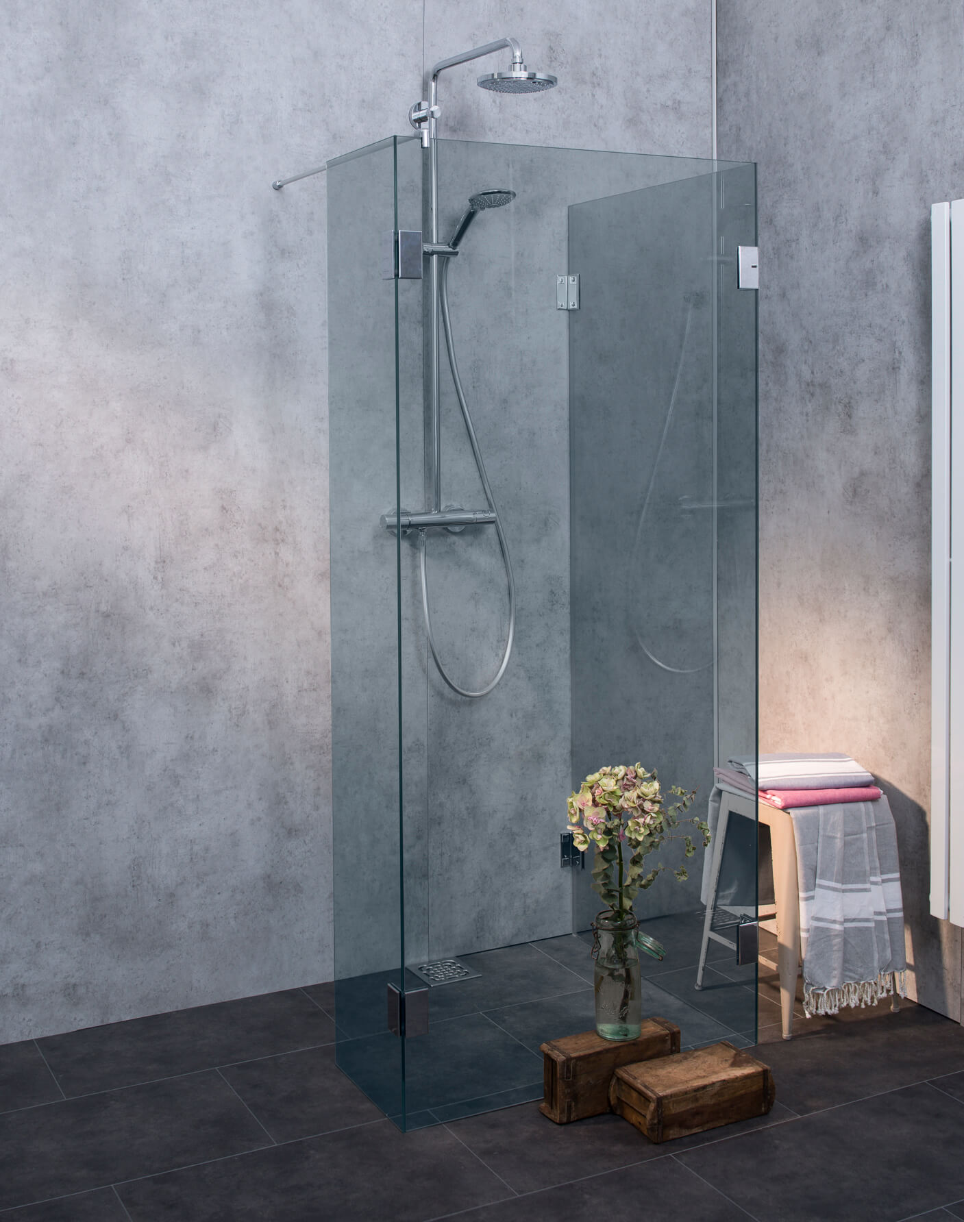| Einbausituation: | Walk In Dusche, Freistehende Duschwand, U Walk In Dusche, Dusche nach Maß |