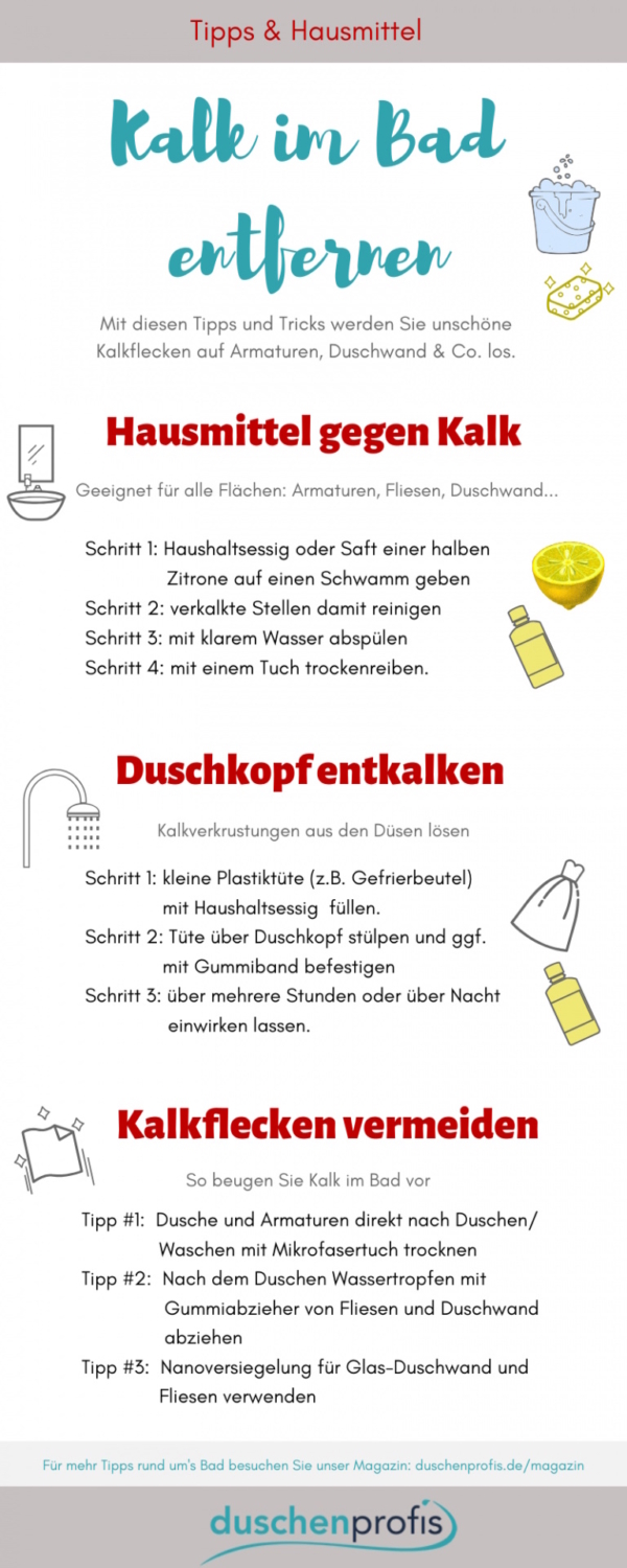 Ideale Hausmittel zur Kalkentfernung sind Essigessenz oder Zitronensäure. Dank der Säure beider Mittel können Sie auch hartnäckige Kalkspuren auf Badarmaturen, Duschabtrennungen oder Fliesen schnell beseitigen. Achtung bei den Fugen: Hier kann die Säure von Essig oder Zitrone das Material angreifen, deshalb die Fliesenfugen immer nur mit mildem Reinigungsmittel säubern. Mehr Tipps und Infos zur Fugensäuberung finden Sie in unserem Magazinbeitrag 6 Profi-Tipps: So bringen Sie Ihre Fliesenfugen wieder zum Strahlen!